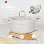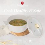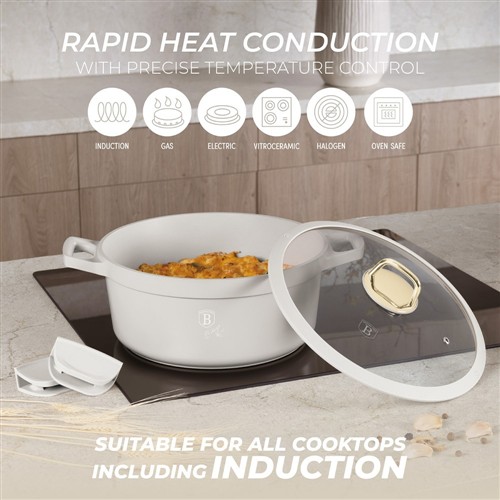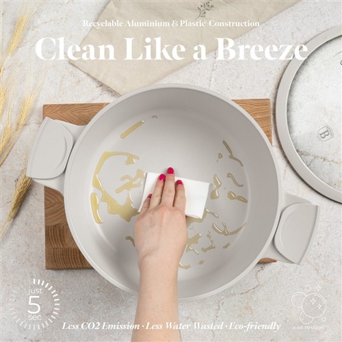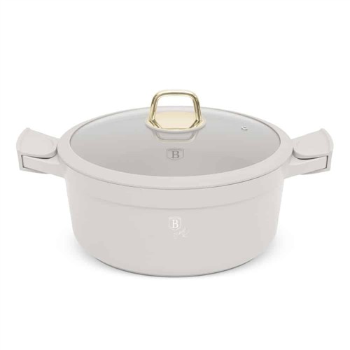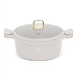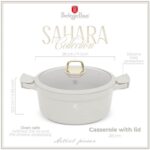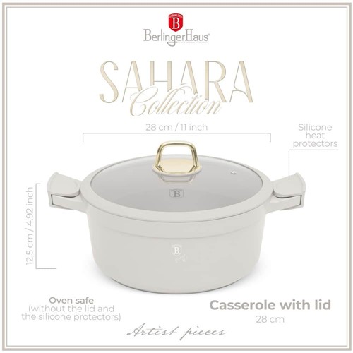 The Berlinger Haus BH‑7788 Casserole with Lid is part of the Sahara Collection, designed for stylish and practical cooking. Crafted from forged aluminium with a triple‑layer marble non‑stick coating, this 28cm casserole pot ensures healthier cooking with minimal oil and easy food release. The tempered glass lid retains heat and flavour, while the ergonomic soft‑touch handles provide safe and comfortable use. Finished in soft matt cream, it coordinates perfectly with other Sahara cookware and kitchen accessories.