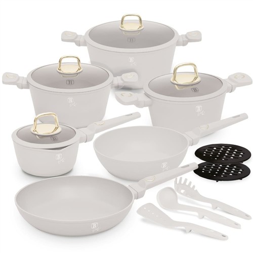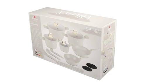 The Berlinger Haus BH‑8081NN Cookware Set is part of the Sahara Collection, combining elegant design with professional performance. Crafted from forged aluminium with a durable triple‑layer marble non‑stick coating, this 15‑piece set provides everything needed for versatile cooking. Finished in soft matt cream, it offers excellent heat distribution, energy efficiency, and stylish presentation. Ergonomic soft‑touch handles ensure safe and comfortable use, while the induction‑ready bases make the set suitable for all hob types.