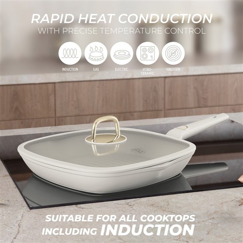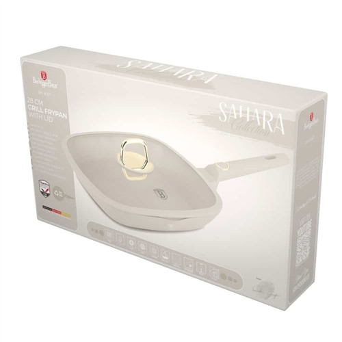 The Berlinger Haus BH‑8067WM Grill Pan with Lid is part of the Sahara Collection, combining elegant design with professional performance. Crafted from forged aluminium with a triple‑layer marble non‑stick coating, it ensures healthier cooking with minimal oil and easy food release. The 28cm square pan includes a matching glass lid, making it ideal for grilling meats, vegetables, and fish while retaining moisture and flavour. Finished in soft matt cream, it coordinates perfectly with other Sahara cookware and kitchen accessories.