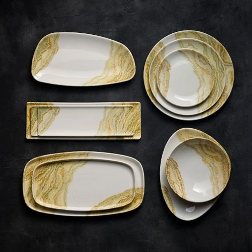 The Churchill Coupe Plate in Tide Gold is part of the Inked Tide collection, launched in Spring 2024, and inspired by the fluid motion of coastal landscapes. Crafted from super vitrified ceramic, this 17cm plate features a reactive golden glaze with a white tide accent, offering a warm, organic aesthetic ideal for bread, sides, petit fours, or small plated starters in hospitality settings.
