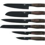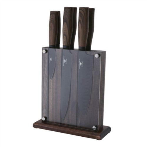 • Material: Stainless Steel Blades with Black Oxide Coating, Soft-Touch Wood-Effect Handles, Wooden Block