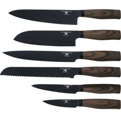 The Rockingham Forge RF-618/7P Knife Block Set from the Forester Series is a stylish and functional 7-piece ensemble designed for modern kitchens. Featuring black oxide-coated stainless steel blades and ergonomic soft-touch wooden-effect handles, this set combines performance with safety. Each knife includes a rounded “Safe-D” tip to reduce injury risk, and the set is housed in a compact wooden block with a clear plastic coating for easy access and elegant presentation.