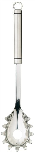 The KitchenCraft Professional Pasta Server is a durable stainless steel utensil designed for lifting, serving, and portioning pasta such as spaghetti, linguine, and tagliatelle. Featuring pronged edges to grip pasta securely and a central draining hole to release excess water, it ensures efficient serving straight from the pan. The ergonomic handle provides comfort and control, while the polished stainless steel finish offers a professional look suitable for both home kitchens and catering environments.