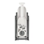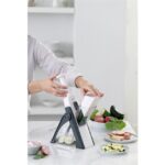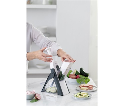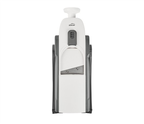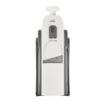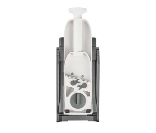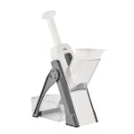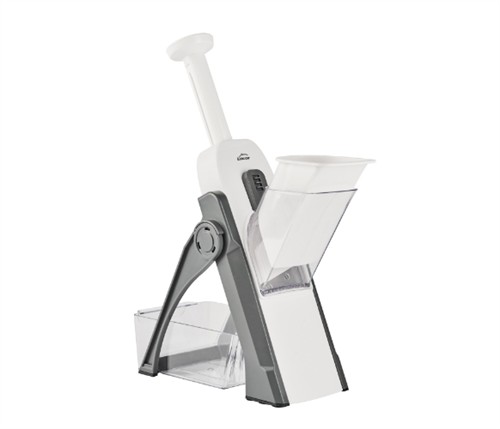 This vertical mandoline is engineered for speed, precision, and safety. The vertical design allows gravity to assist the cut, while the automatic setback lever resets the blade position after each stroke.