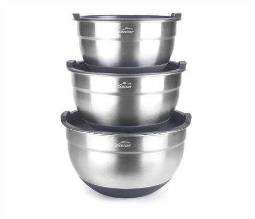 This Lacor 3‑piece mixing bowl set is built from high‑quality stainless steel with a satin interior and exterior finish for durability and hygiene. Each bowl includes a BPA‑free airtight polypropylene lid, making the set suitable for both preparation and storage.