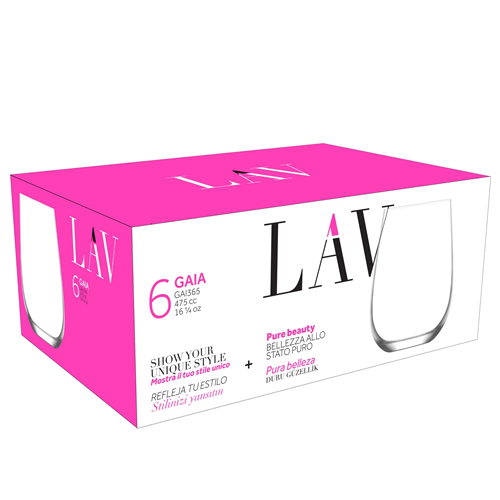 The LAV® Gaia Glass Tumblers 480ml offer a modern and ergonomic design, perfect for enhancing the enjoyment of your favorite beverages. Crafted from high-quality glass, these stemless tumblers feature a low center of gravity for added stability and a comfortable grip. With a generous 480ml capacity, they are ideal for serving wine, cocktails, and more. Part of the innovative LAV range, these tumblers combine contemporary aesthetics with everyday functionality, making them suitable for both home and professional use.