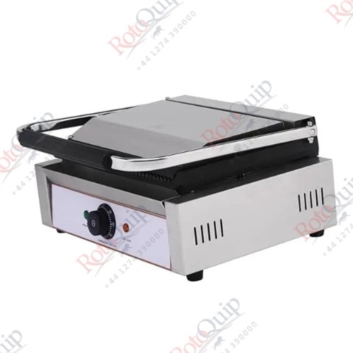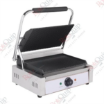 The Roto Quip RPG-MA Electric Single Contact Grill is a high-performance commercial grill, designed for grilling paninis, sandwiches, meats, and vegetables with precision. Featuring ribbed top and bottom cast iron plates with ceramic coating, this unit ensures even heat distribution and professional sear marks. The adjustable thermostat allows precise temperature control up to 320°C, while the rotating shaft suspension system ensures smooth operation. The stainless steel structure enhances durability, and the cool-touch Bakelite handle provides safe handling.