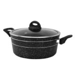 The Royalford 28cm Forged Aluminium Casserole Dish (RF11867) is designed for high-performance cooking with a stylish, durable build. Featuring a heavy-duty forged aluminium body and a marble-effect non-stick coating, it ensures even heat distribution, energy efficiency, and easy cleanup. The tempered glass lid with a wide steel rim allows gradual steam release, while soft-touch heat-resistant handles offer safe handling across all hob types including induction.