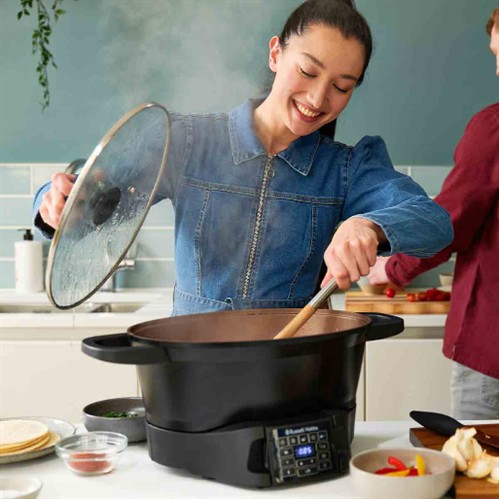The Russell Hobbs Good to Go Multicooker (model 28270) in Black is a high-capacity, multi-function cooking solution designed for busy households and hospitality setups. With 8 versatile cooking modes and a removable control panel, it transitions seamlessly from countertop to tabletop. The cast aluminium pot offers excellent heat distribution and durability, while the sleek black finish complements modern kitchen aesthetics.