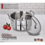 The casserole includes a matching stainless steel lid for heat retention and moisture control. Twin riveted handles provide secure grip and long-term durability, while the polished silver finish adds a professional touch to both domestic and commercial kitchens.