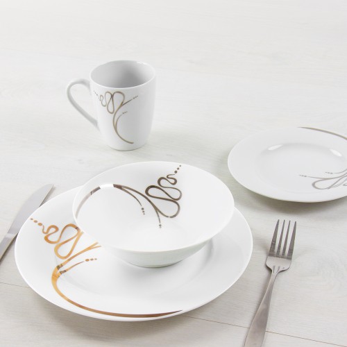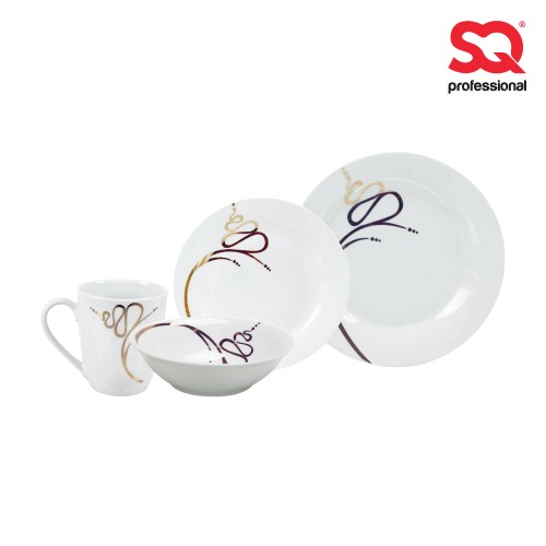 The SQ Professional 16‑Piece Gold Rim Dinner Set combines classic white porcelain with an elegant gold‑trimmed finish, creating a luxurious table setting suitable for both everyday dining and special occasions. Crafted from high‑quality porcelain, each piece offers excellent durability, chip resistance, and a smooth glazed surface. The set includes dinner plates, side plates, bowls, and mugs, making it a complete solution for a family of four.