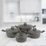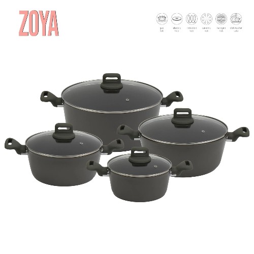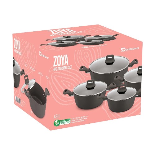 The SQ Professional Zoya 4‑Piece Stockpot Set in Ash is a premium forged‑aluminium cookware collection designed for durability, fast heat distribution, and modern kitchen styling. Each pot features a high‑performance non‑stick coating for effortless food release and easy cleaning. The tempered glass lids include steam vents for controlled cooking, while the stay‑cool handles ensure safe handling. Suitable for all hob types, including induction, this set is ideal for everyday cooking, batch preparation, and family meals.
