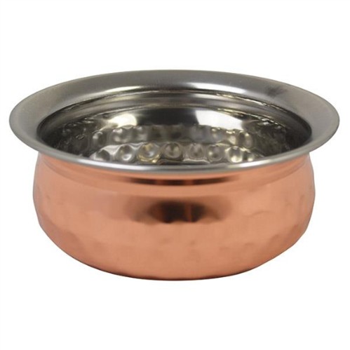 The Zodiac CPH13 Copper Handi Dish 12cm is a traditional serving vessel ideal for presenting curries, rice, and side dishes in restaurants and catering environments. Crafted with a hammered copper exterior and a stainless steel interior, it combines authentic aesthetics with practical durability. The double-base construction ensures even heat distribution and long-lasting performance, making it suitable for both presentation and light reheating.